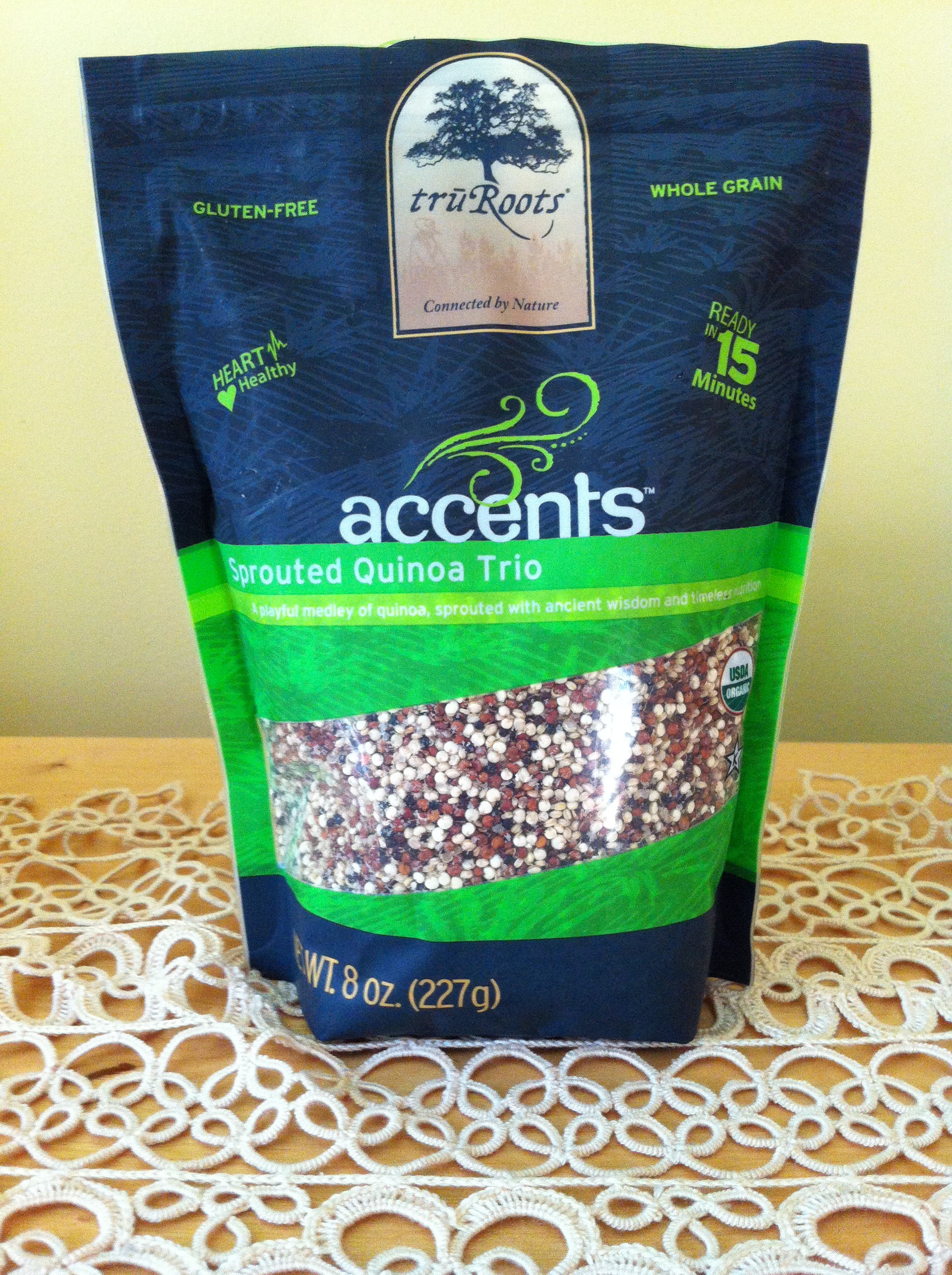 I went into the whole grain section of the store and found a wonderful product that goes into my *I ADORE* category. Pre-washed and sprouted Quinoa Trio by a company called Tru Roots.