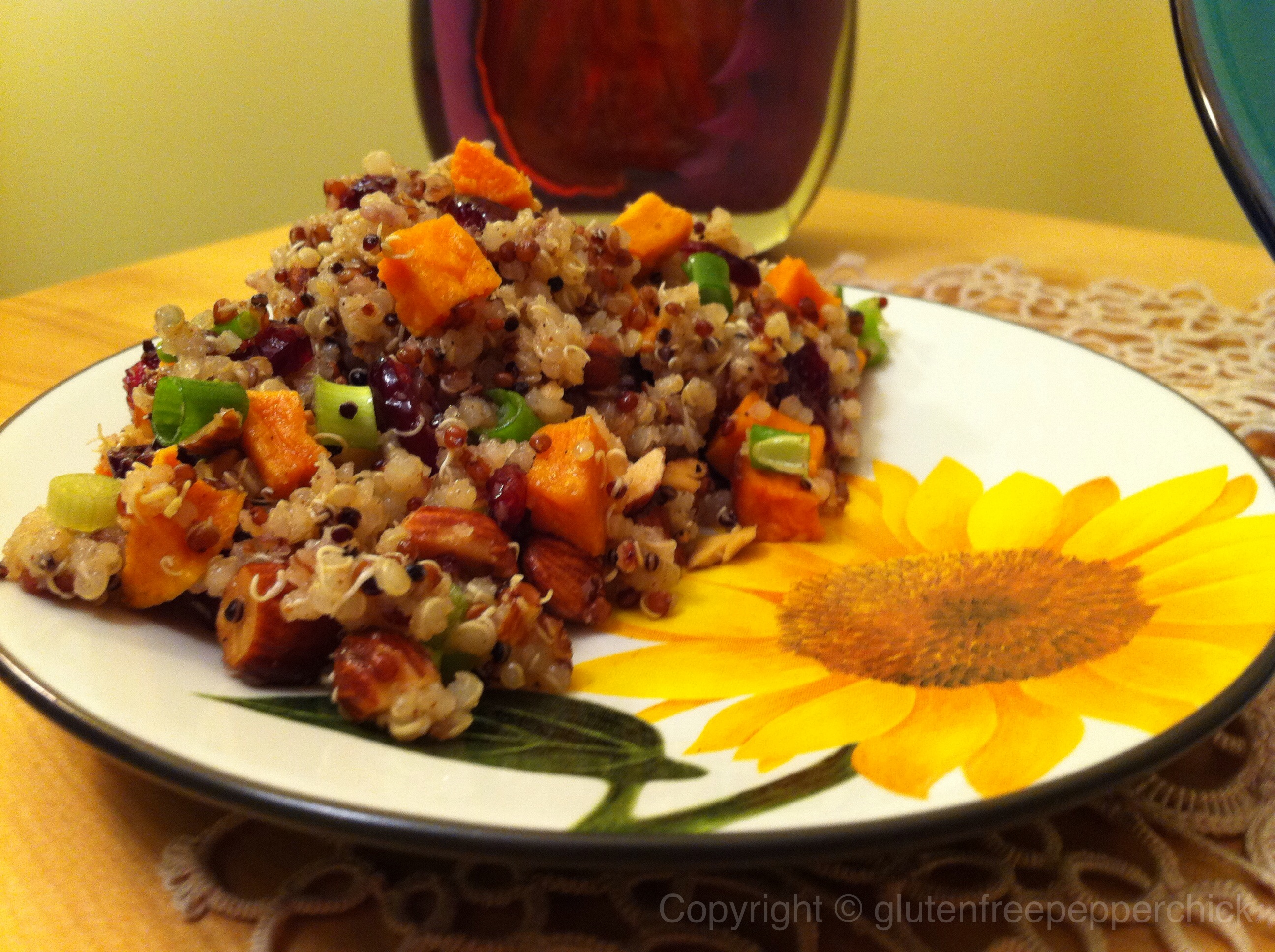 Quinoa is an excellent addition to a gluten free diet because it provides a complete protein and is also high in fiber, magnesium, manganese, and many other nutrients. People with celiac disease often have absorption problems, and eating foods high in nutrients is greatly beneficial to them. Vegetarian diets also benefit from quinoa because of its high protein content. The addition of nuts, sweet potatoes, and cranberries adds vitamin A, Vitamin C, and even more protein.