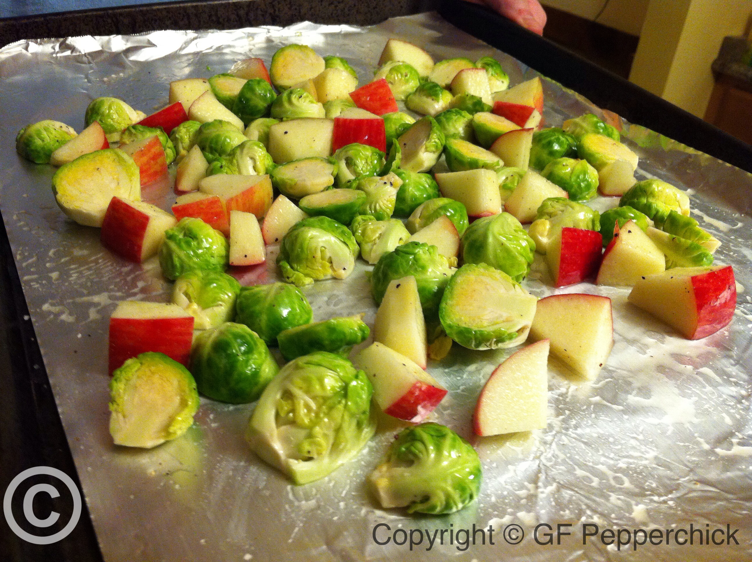 - 1 Large Apple, skin left on, cored and cut into chunks roughly the same size as the brussel sprouts