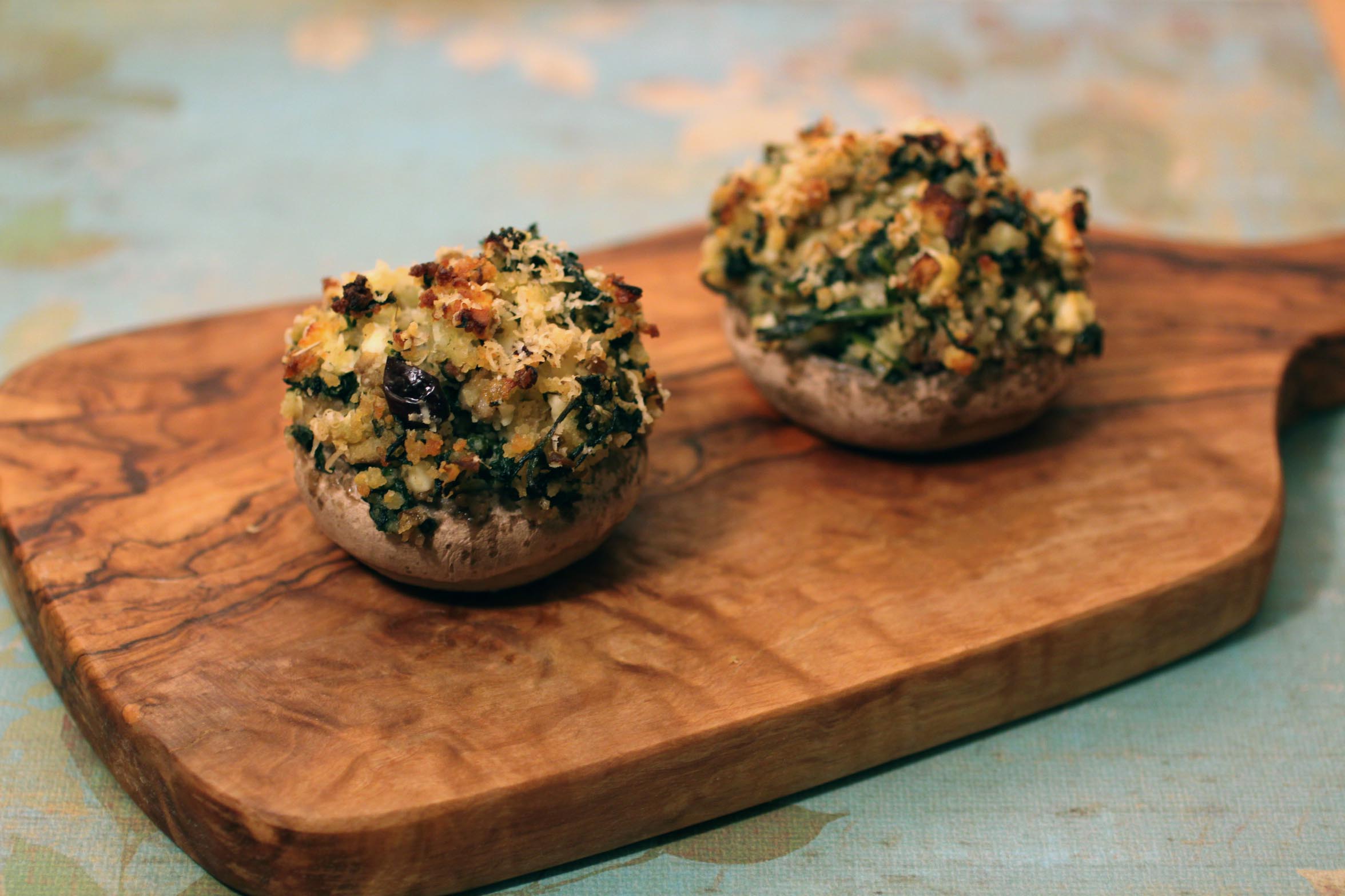 Stir in gluten free Panko bread crumbs, feta cheese, and olives. Stuff mushroom cavities generously with the stuffing mixture, and grate Parmesan cheese over the top. Bake for 25 minutes until heated through, and stuffing starts to brown.