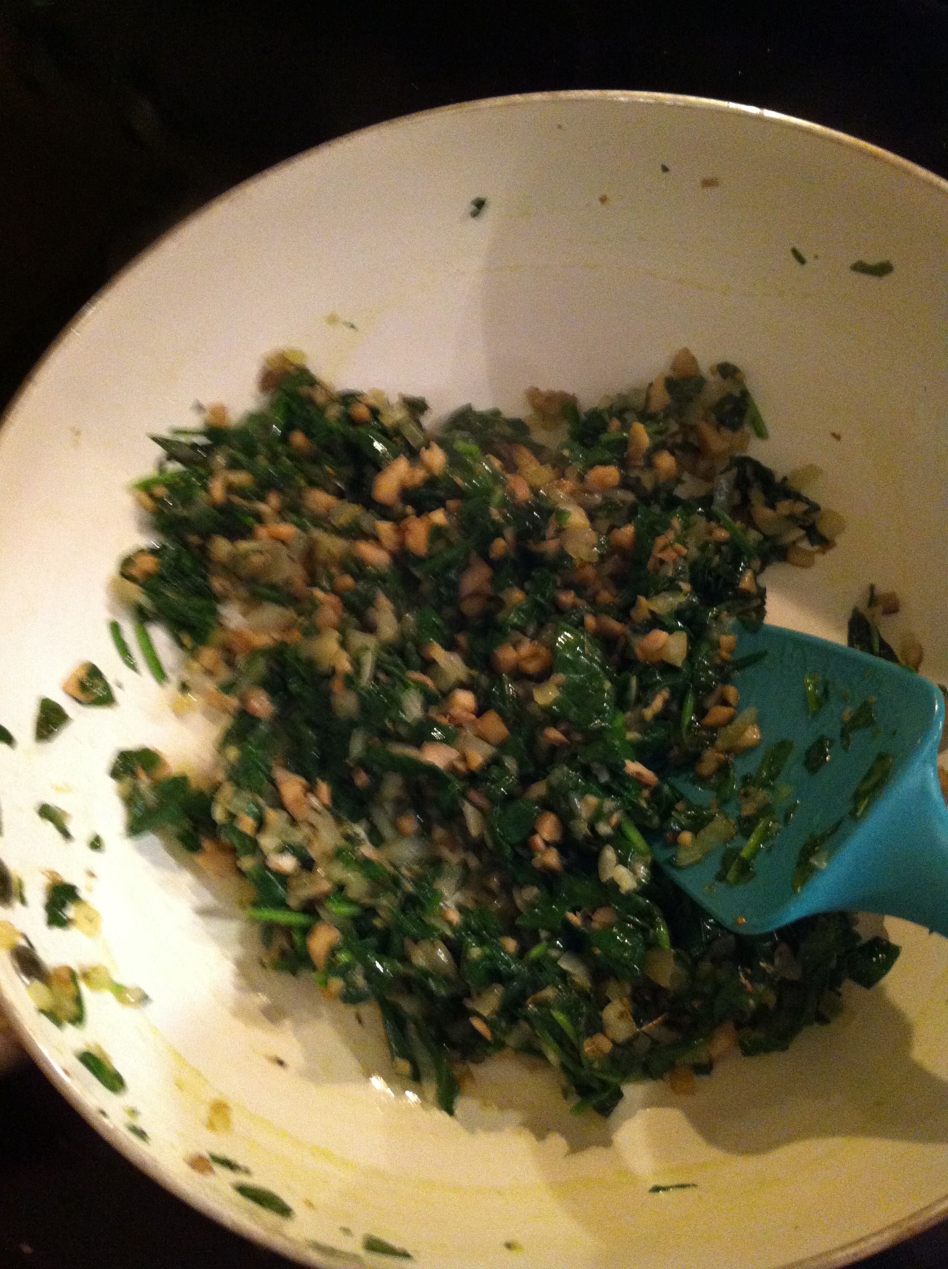 Turn heat to medium high and saute until onions are soft, and mushroom liquid is almost evaporated. Stir in chopped baby spinach and stir until spinach is wilted. Add salt, pepper, and oregano, stirring to combine. Remove from heat.