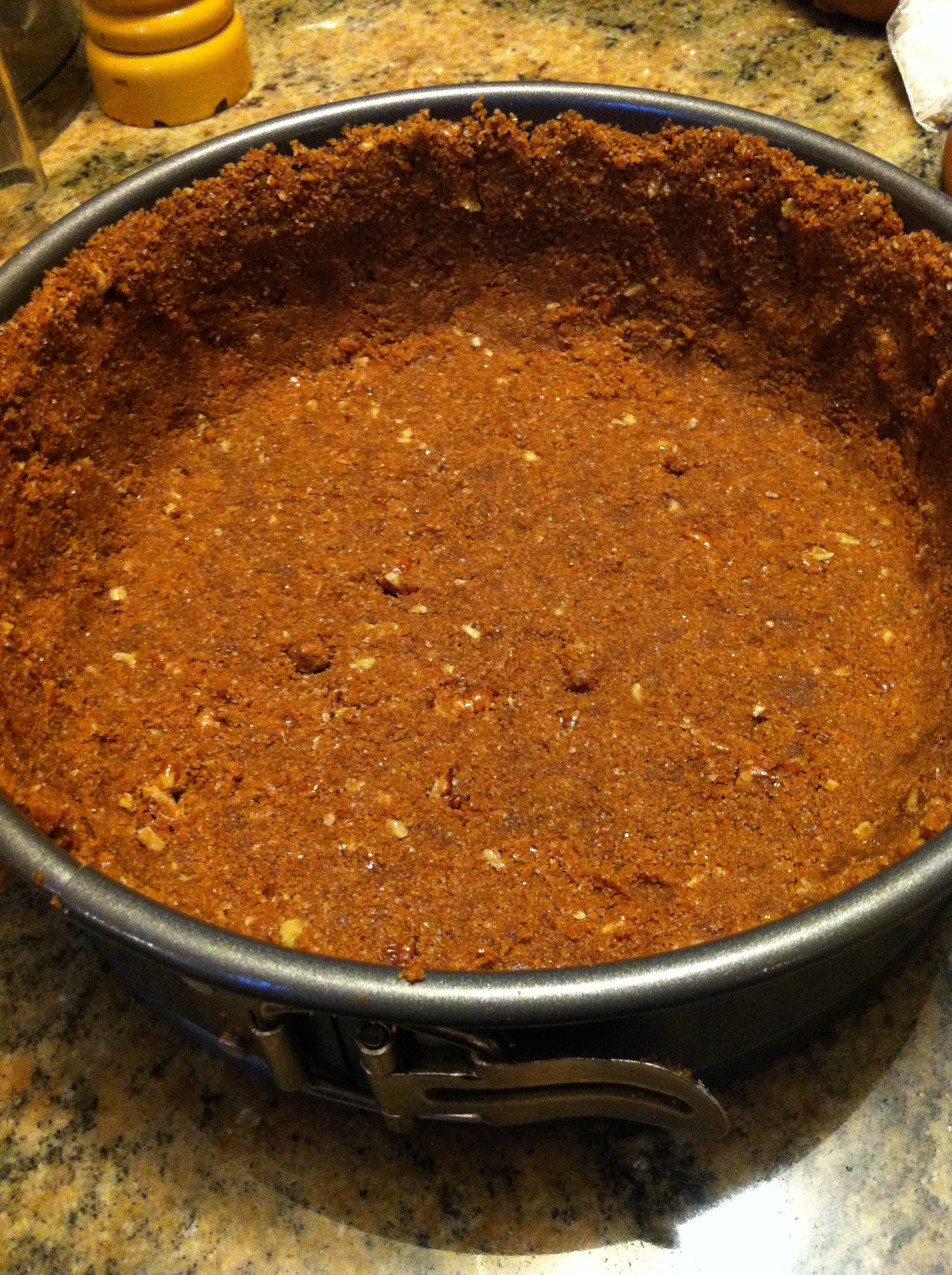 Process enough gluten free gingersnap cookies in a blender or food processor to equal 2 cups of crumbs (I needed about 1 1/2 packages of Pamela’s gluten free gingersnap cookies). Stir in sugar, chopped pecans, and melted butter. Mix together with a fork until well blended.