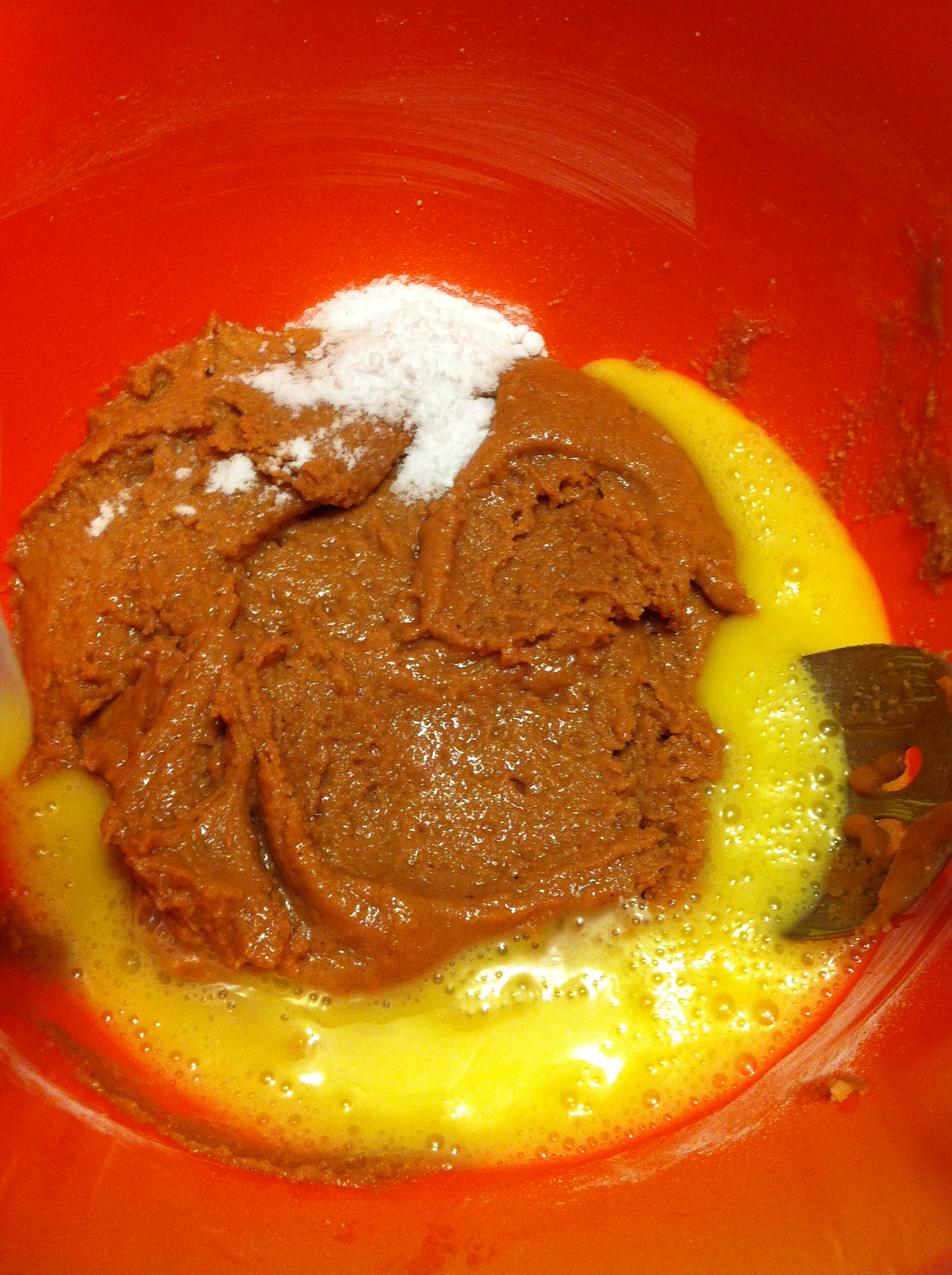 Preheat the oven to 350. Stir together peanut butter and sugar. Add baking soda, salt and egg, and mix thoroughly. Dough will be crumbly.