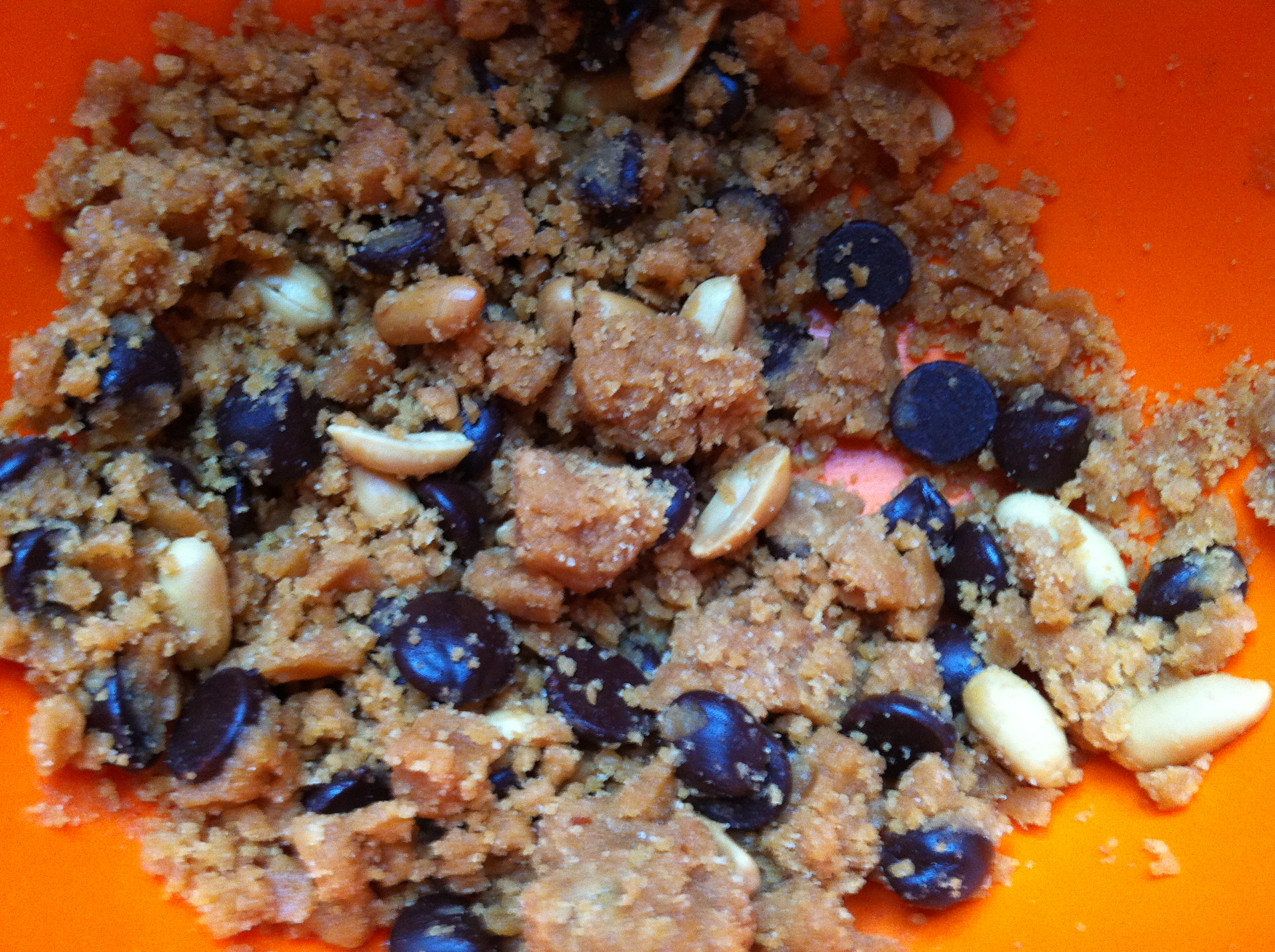 Stir in peanuts and chocolate chips. Measure dough into heaping Tablespoons, and roll dough into balls, pressing the dough around the chocolate chips and peanuts. Place cookie balls on a parchment lined or ungreased cookie sheet two inches apart, and bake for 15 to 17 minutes, or until cookies are golden and puffed.