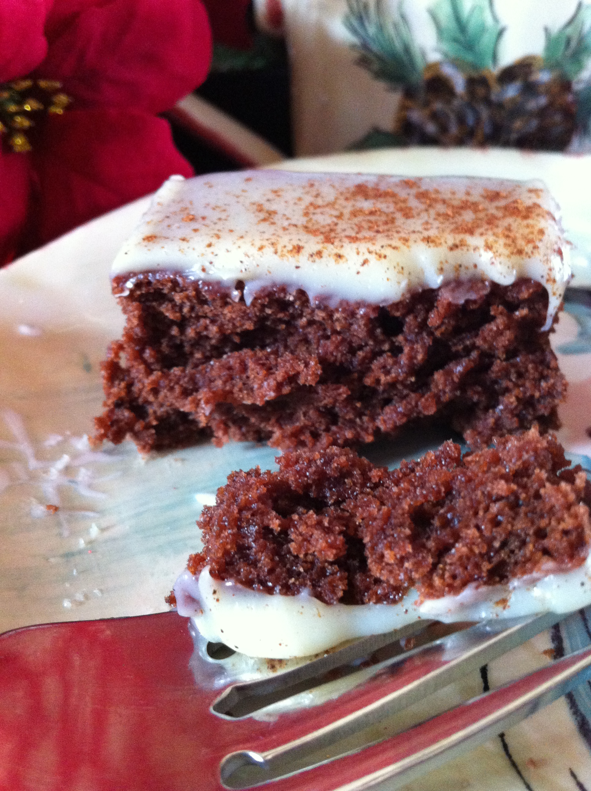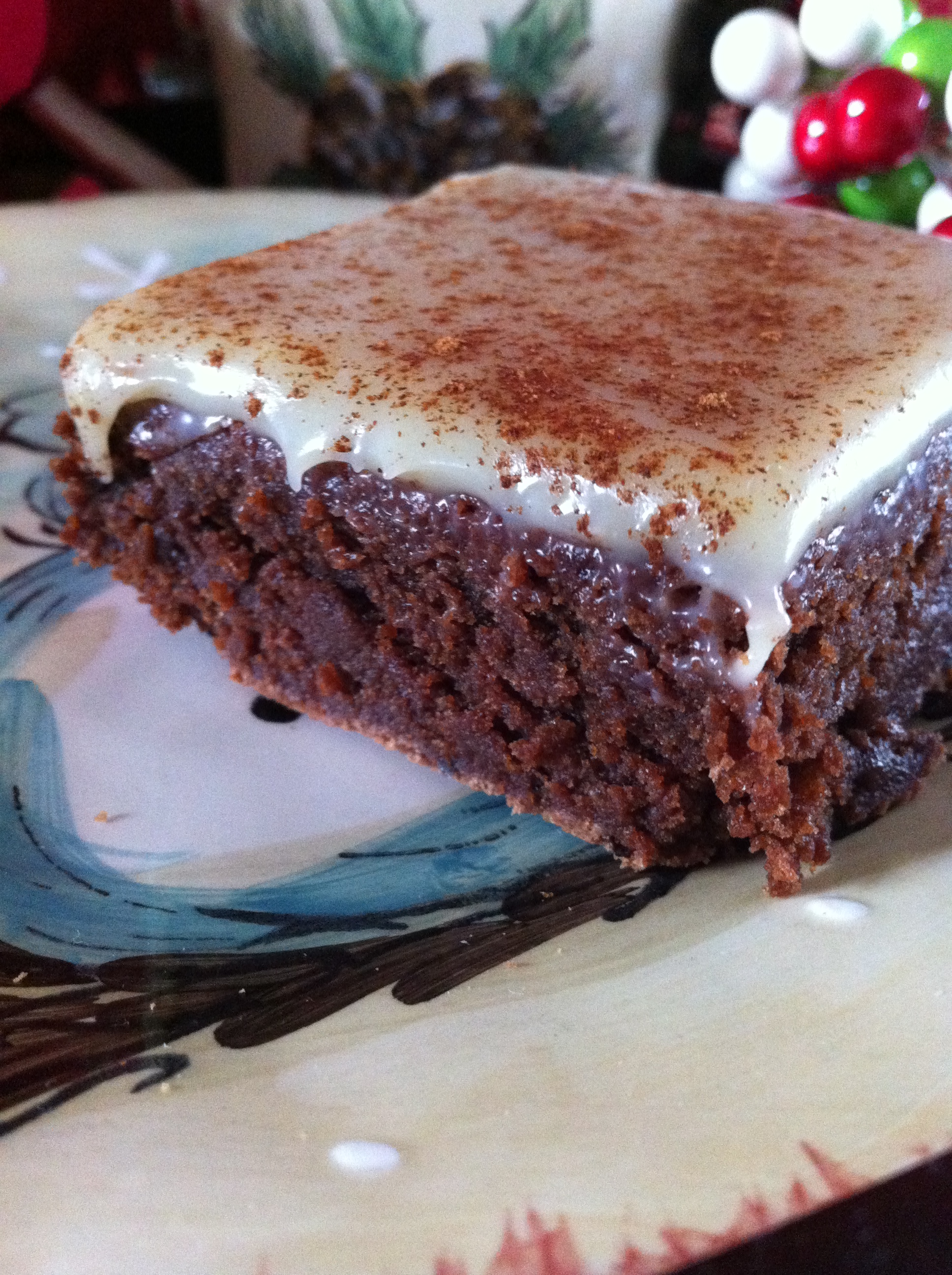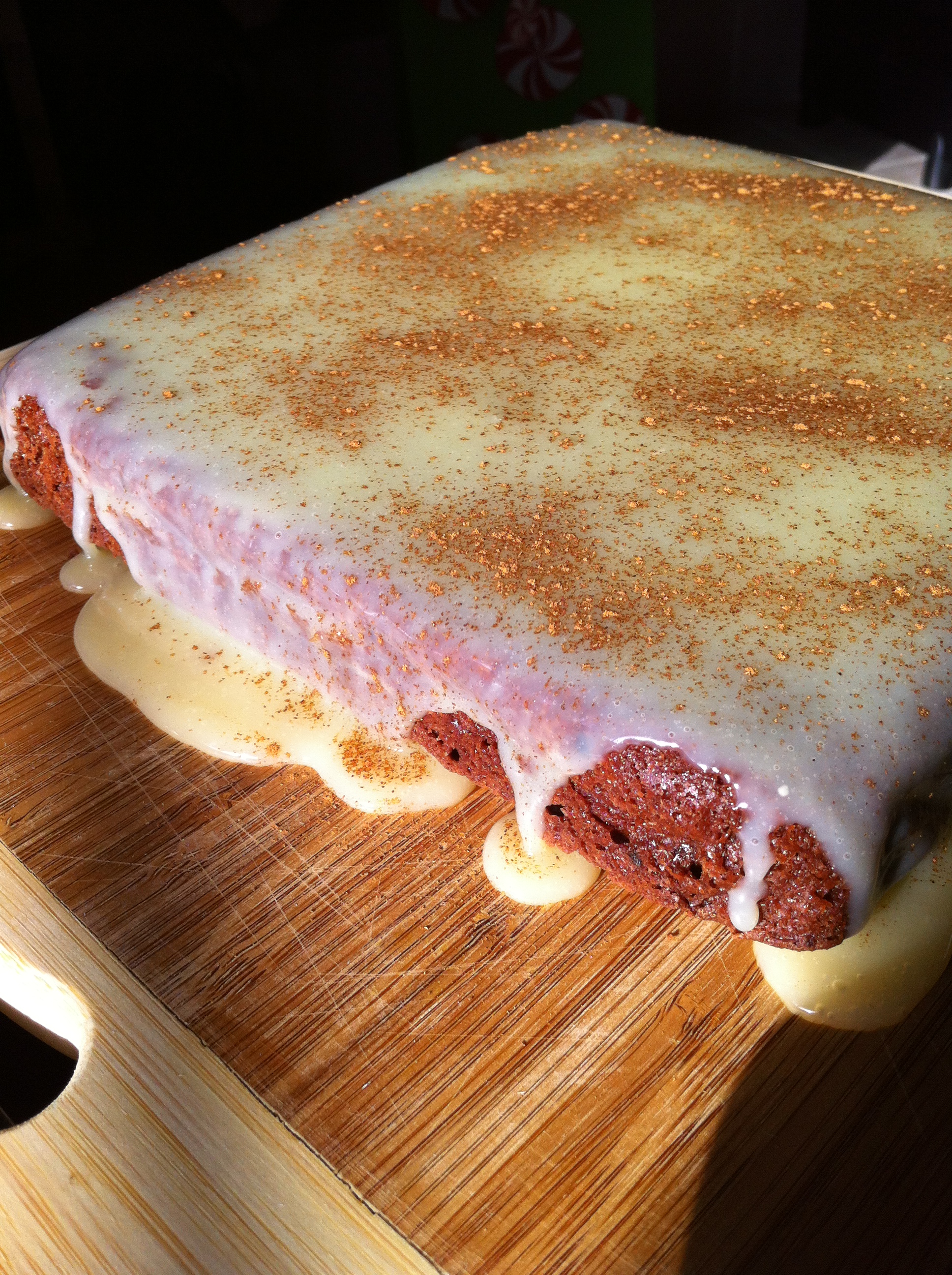 Pour ganache over inverted brownies, and dust with ground cinnamon.