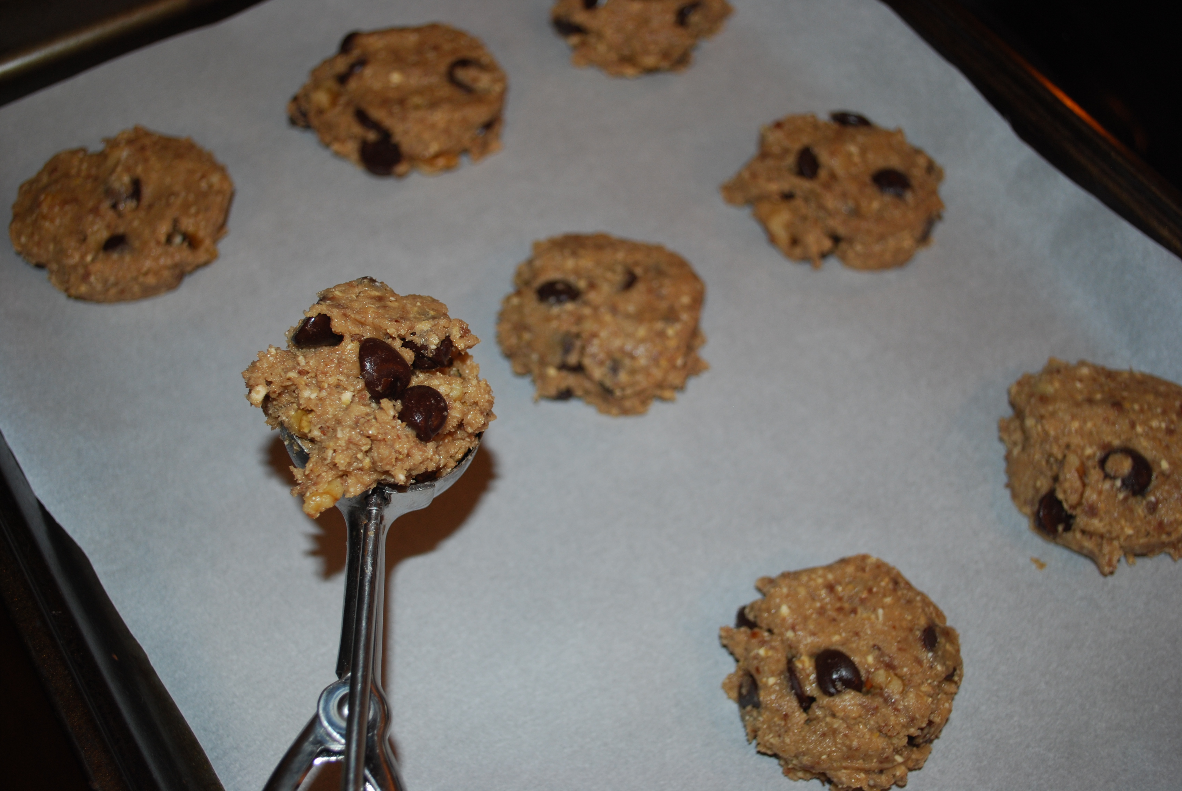 Drop by heaping Tablespoons (or use a small scoop), onto a parchment lined cookie sheet, flattening the dough balls with your hand slightly.